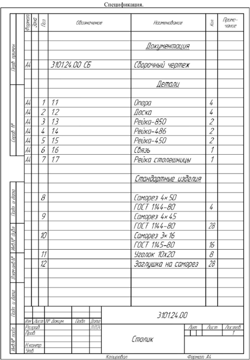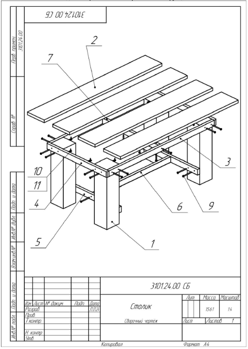 шурупов 4х45 рейки поз. 3,4 и 7. Отверстия в рейках уже просверлены. Проверить длину диагонали между углами опор по всему периметру столика. Допускаемые отклонения ± 1°. Если отклонения превышают допуск – провести регулировку. После регулировки диагоналей собрать нижнюю обвязку столика: прикрепить рейку поз.5 к опорам столика с внутренней стороны (2 шт) при помощи 4 шурупов 4х45 мм. После этого между нижними рейками установить связь поз.6 и скрепить 2 шурупами 4х45 мм.