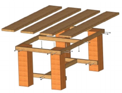 Продолжить сборку столика, наложив доски столешницы поз.2 на собранный каркас. Доски столешницы можно разложить с зазором между ними до 5 мм. Скрепить доски столешницы к каркасу столика при помощи уголков и шурупов 3х16 мм. Дополнительно закрепить столешницу шурупами 4х45 мм через отверстия в рейке столешницы поз.7 снизу столика. Сборка столика завершена. Проверить изделие на устойчивость и жесткость легким пошатыванием столика. Протереть слегка увлажненной мягкой тканью и можно приступать к эксплуатации.